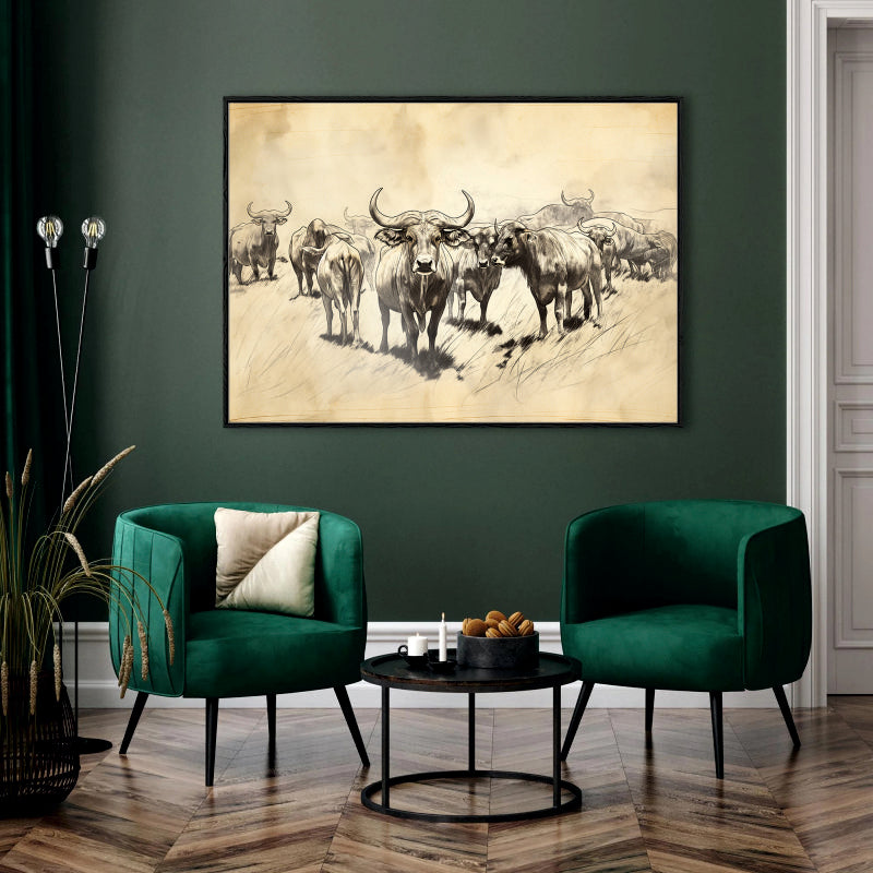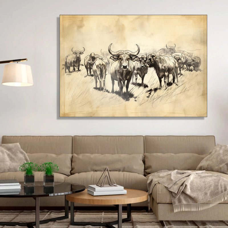 Dusty Herd Canvas Digital Painting - Charcoal Style Buffalo Gathering