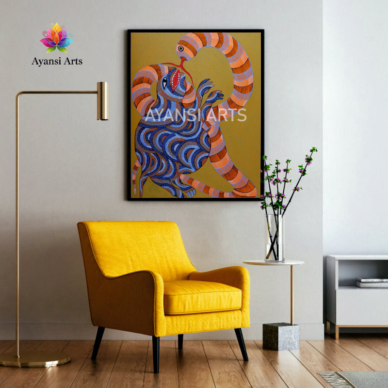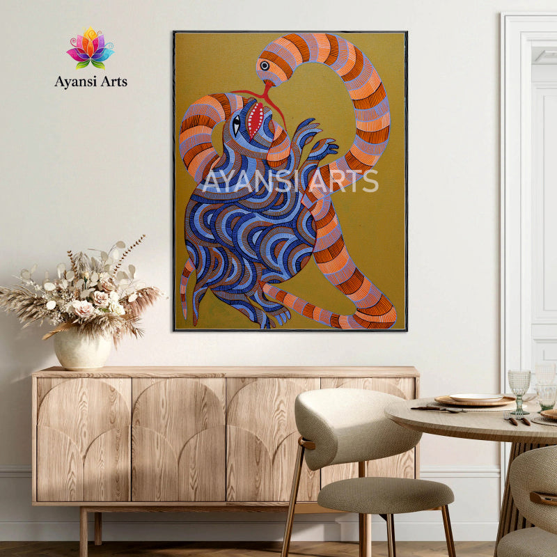 Gond Art Mongoose and Snake Canvas Digital Painting Art by Ayansi Arts