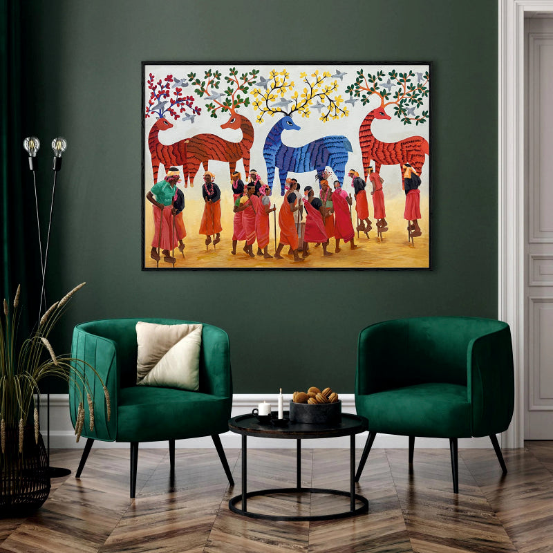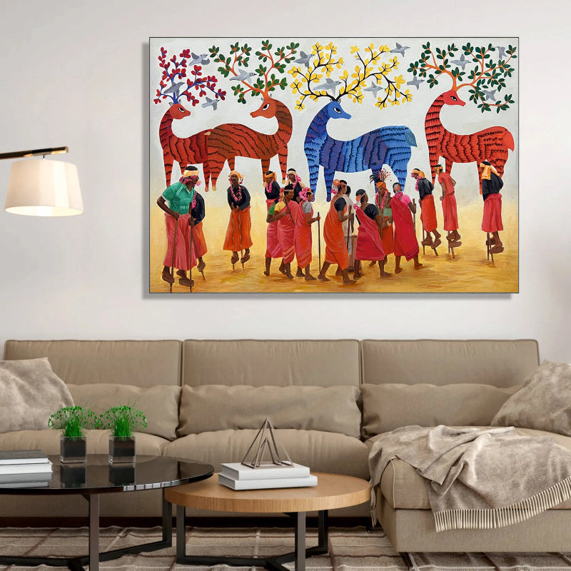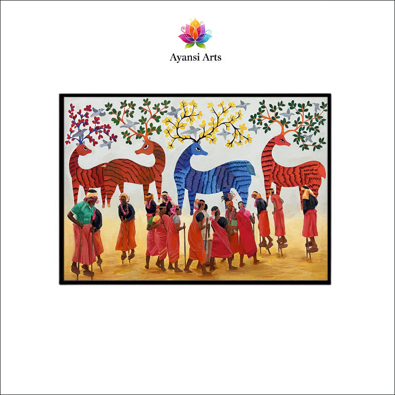 Gond Art Procession with Mythical Deer Canvas Painting by Ayansi Arts