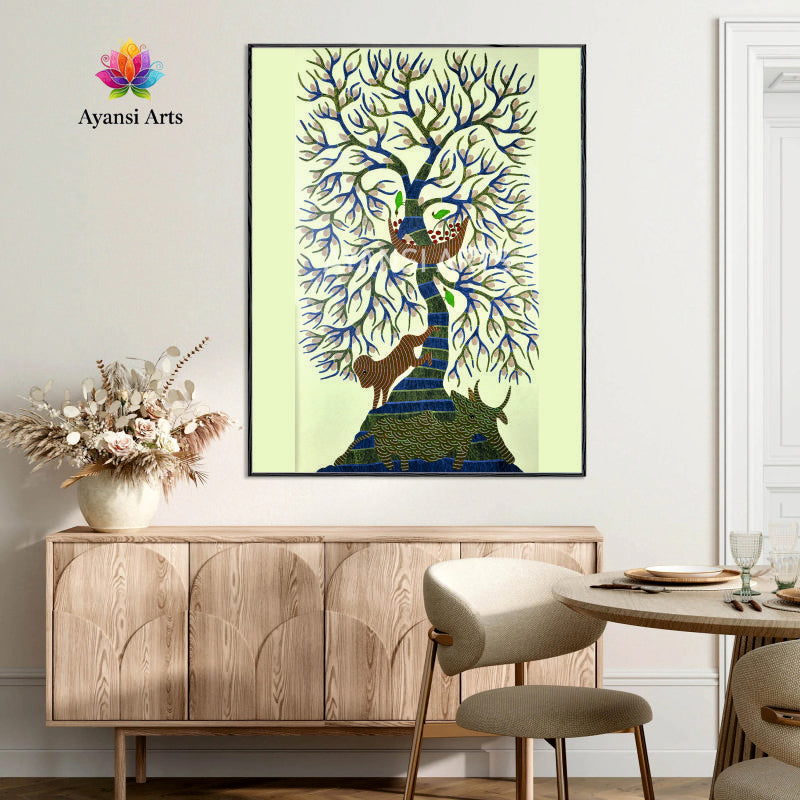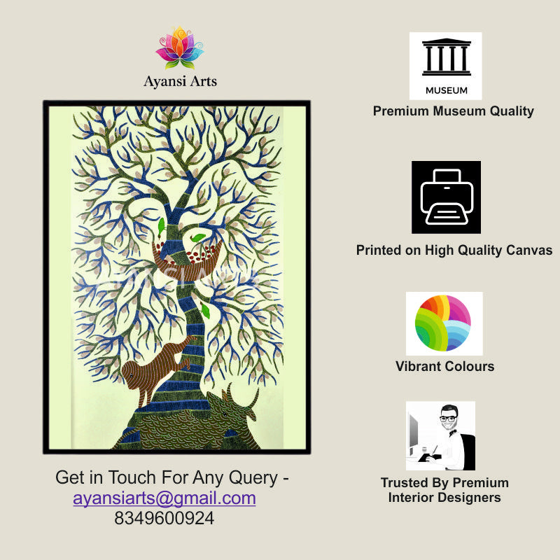 Gond Art Vibrant Tree with Animals Canvas Painting by Ayansi Arts