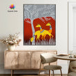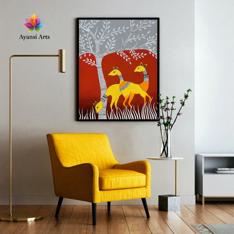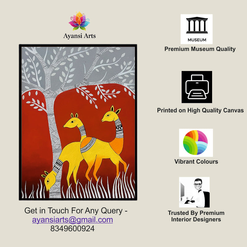 Luminous Yellow Deer under Grey & Red Tree Canvas Digital Art Painting by Ayansi Arts