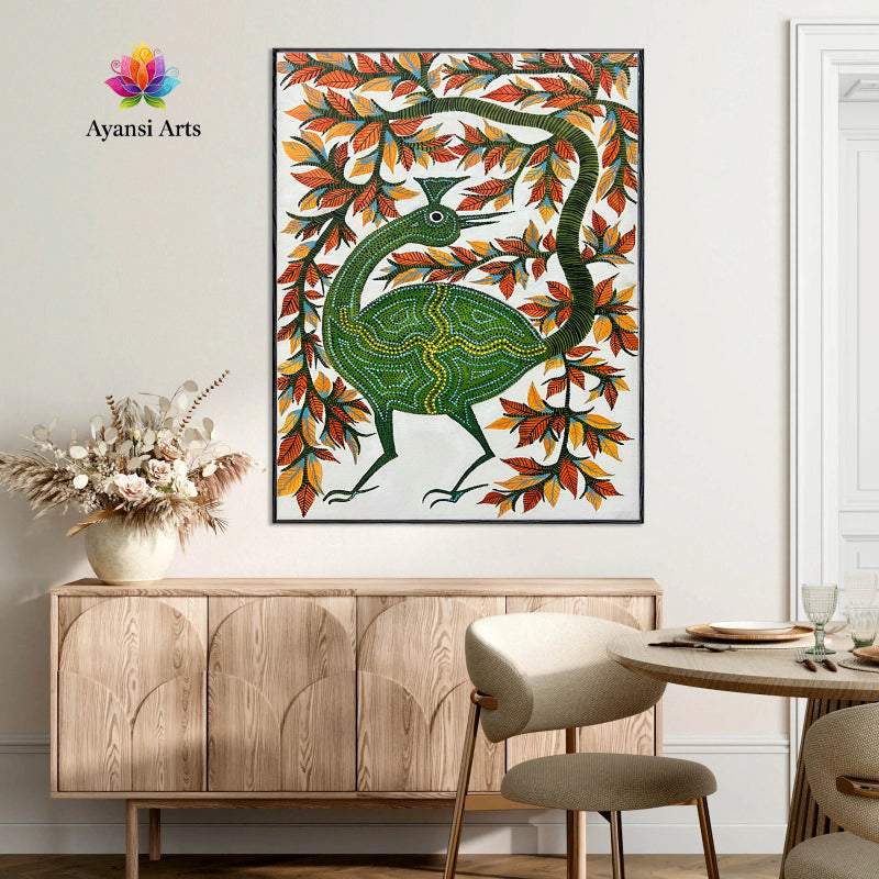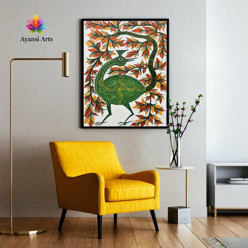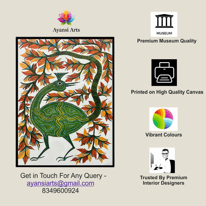 Enigmatic Green Bird under Autumn Tree Tribal Canvas Digital Art Painting by Ayansi Arts