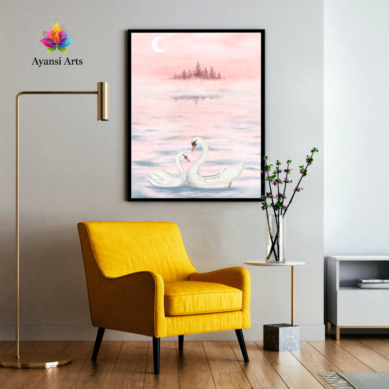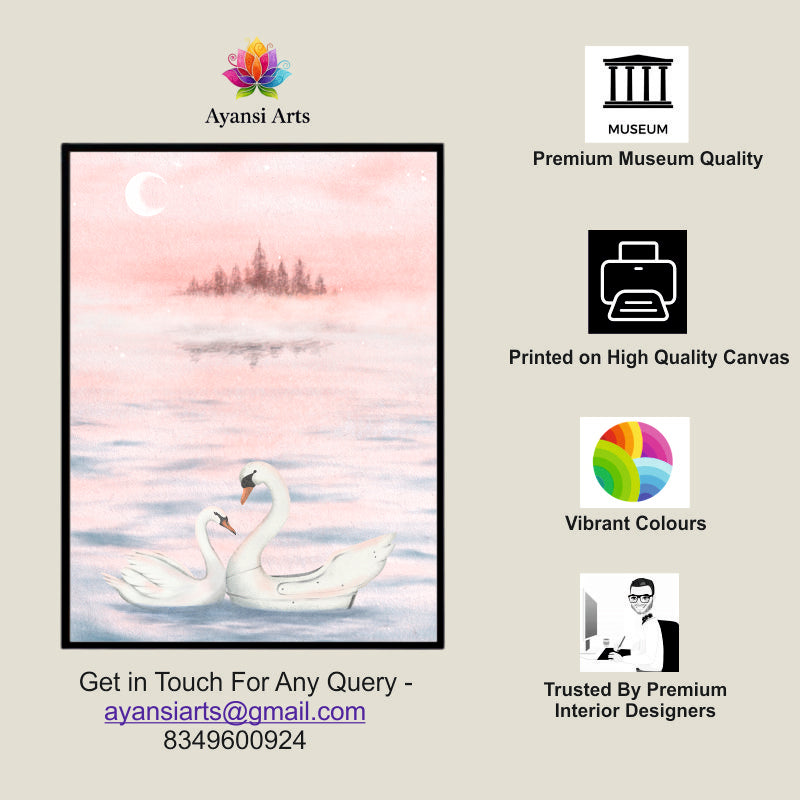Moonlit Serenade: Swans on a Dream Lake Canvas Digital Painting by Ayansi Arts
