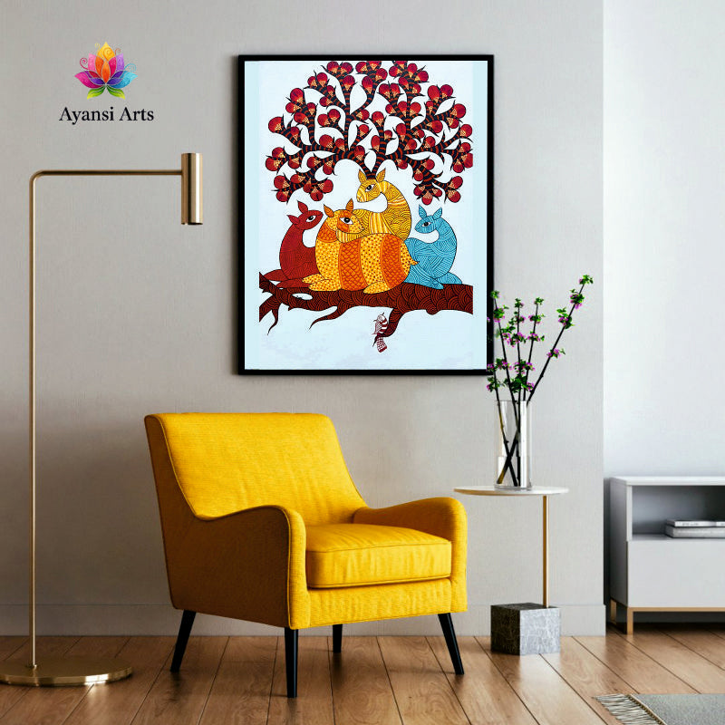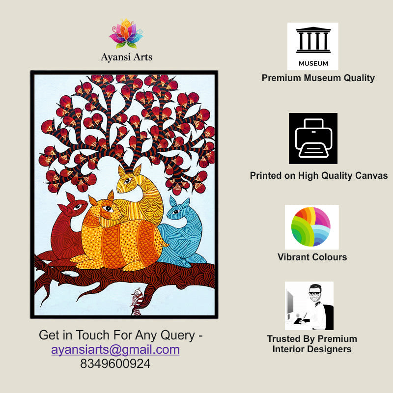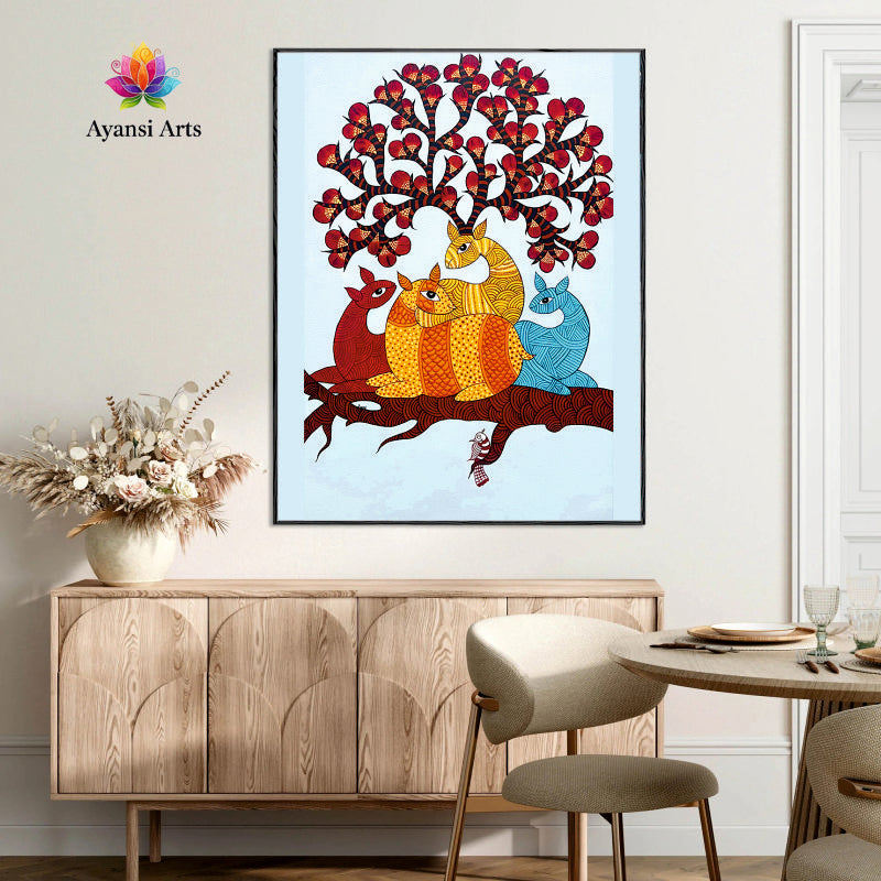 Vibrant Deer Family on Branch under Blossom Tree Canvas Digital Art Painting by Ayansi Arts