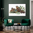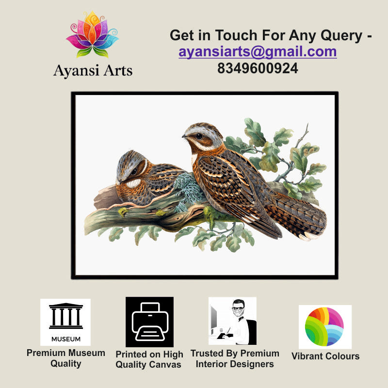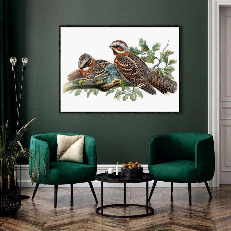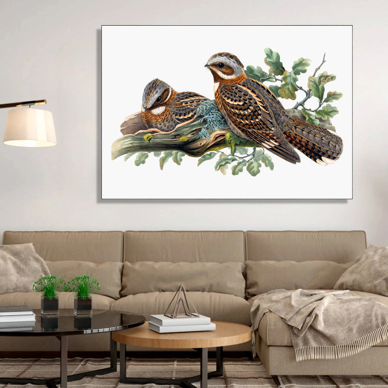Nightjar Duo Canvas Digital Painting - Perched Birds with Oak Leaves