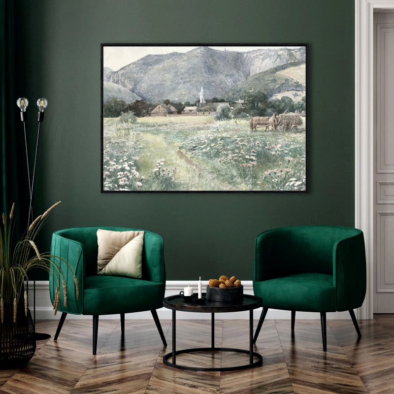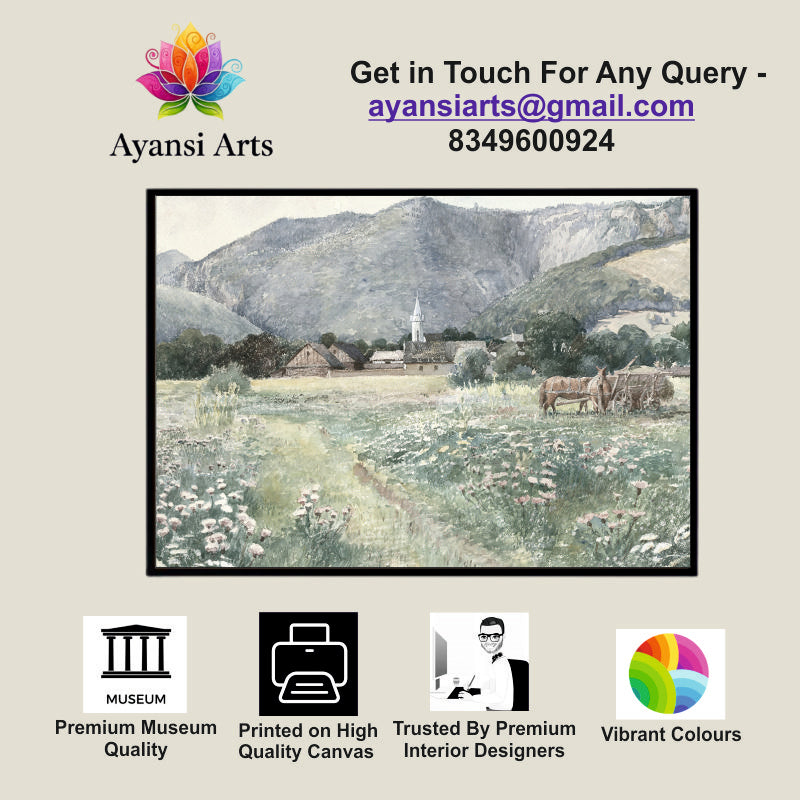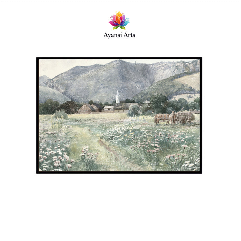 Watercolor Village Meadow Landscape Canvas Digital Painting