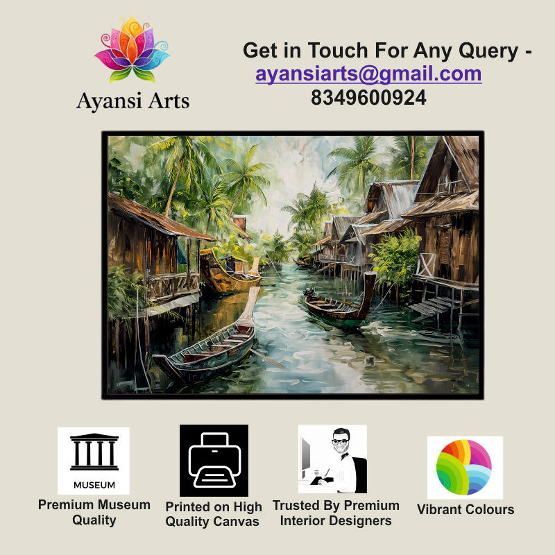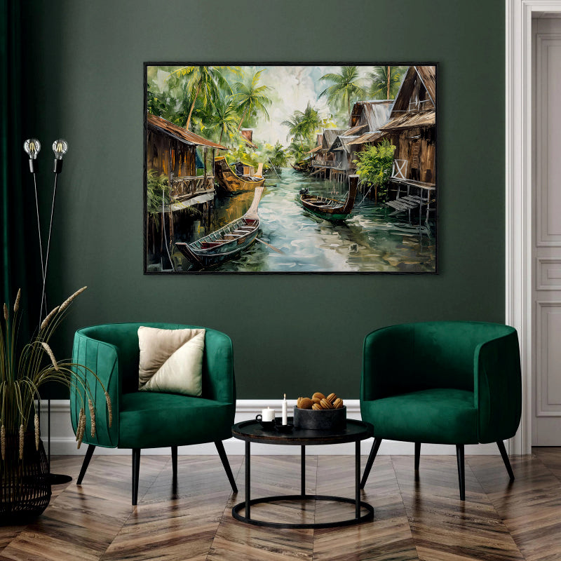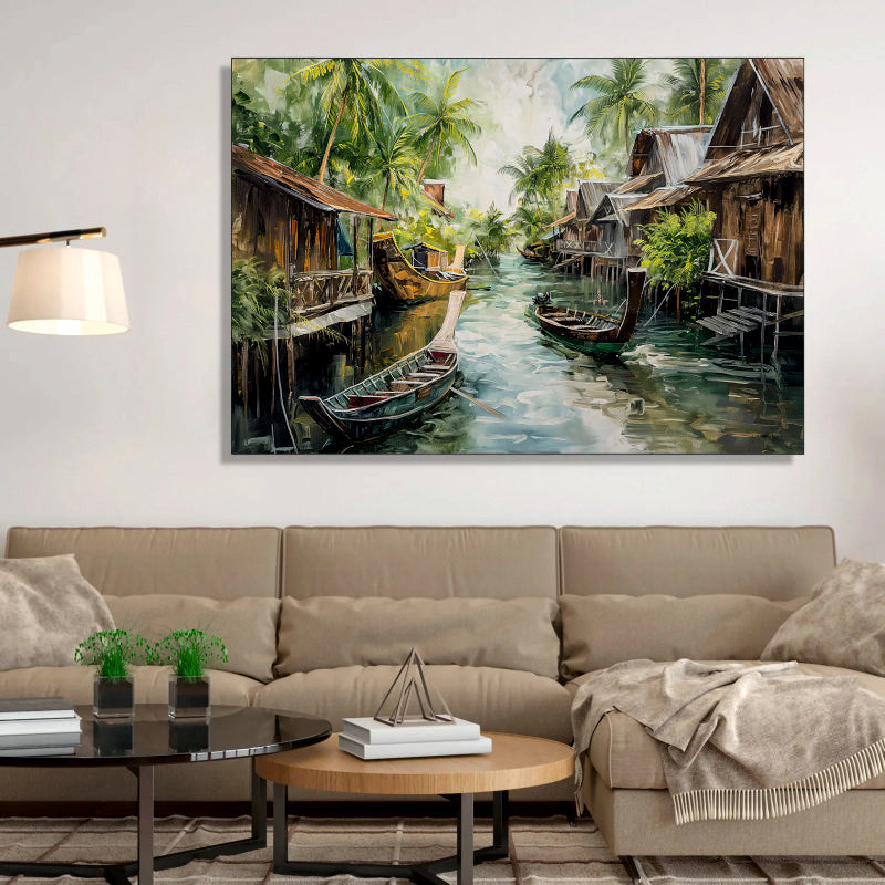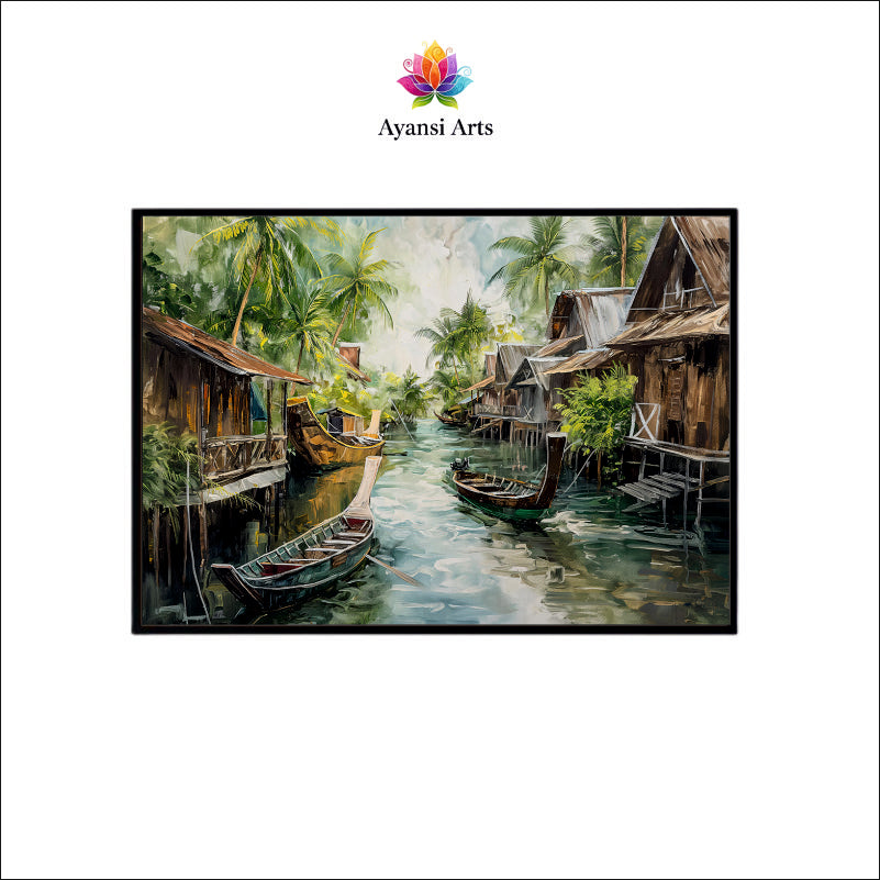 Oil Painted Floating Village Canal Canvas Digital Painting