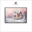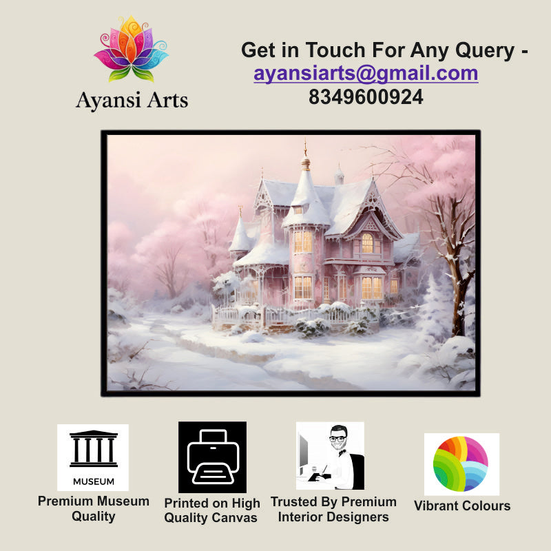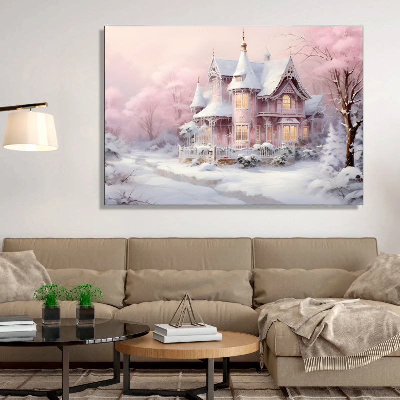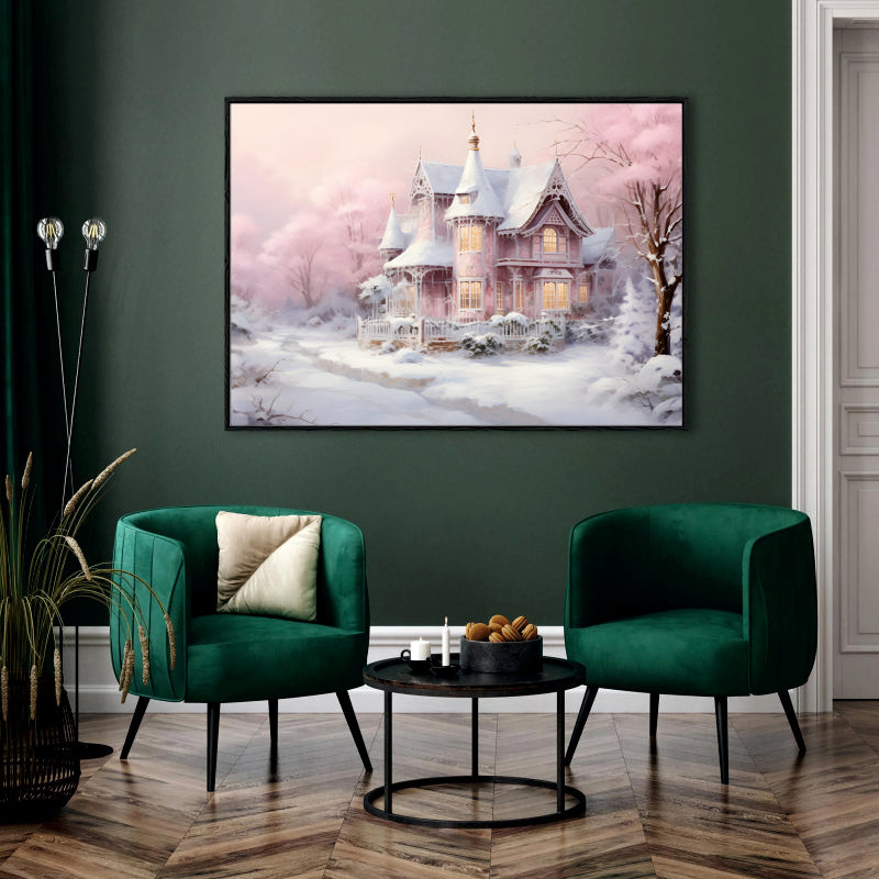 Pink Winter Dream: A Snow-Kissed Victorian House Canvas Painting