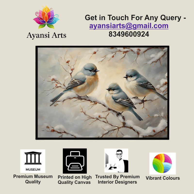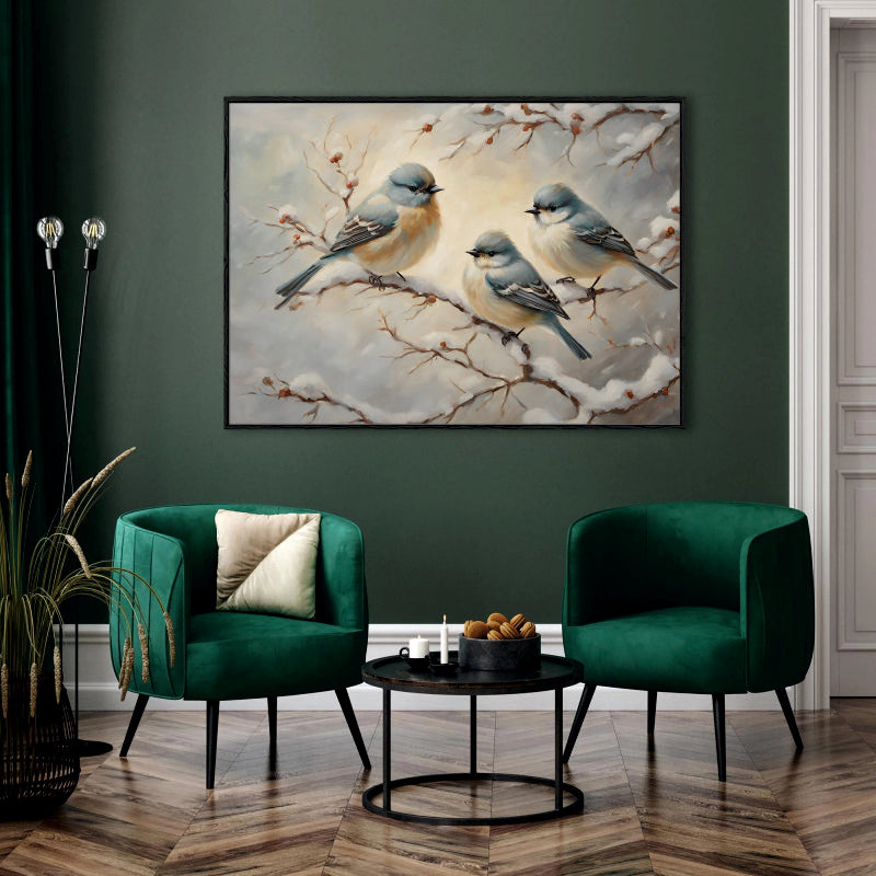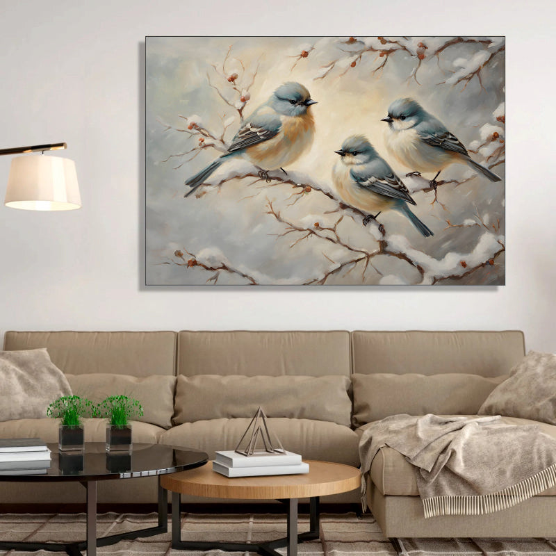 Winter Trio: Birds on a Snowy Branch Canvas Painting