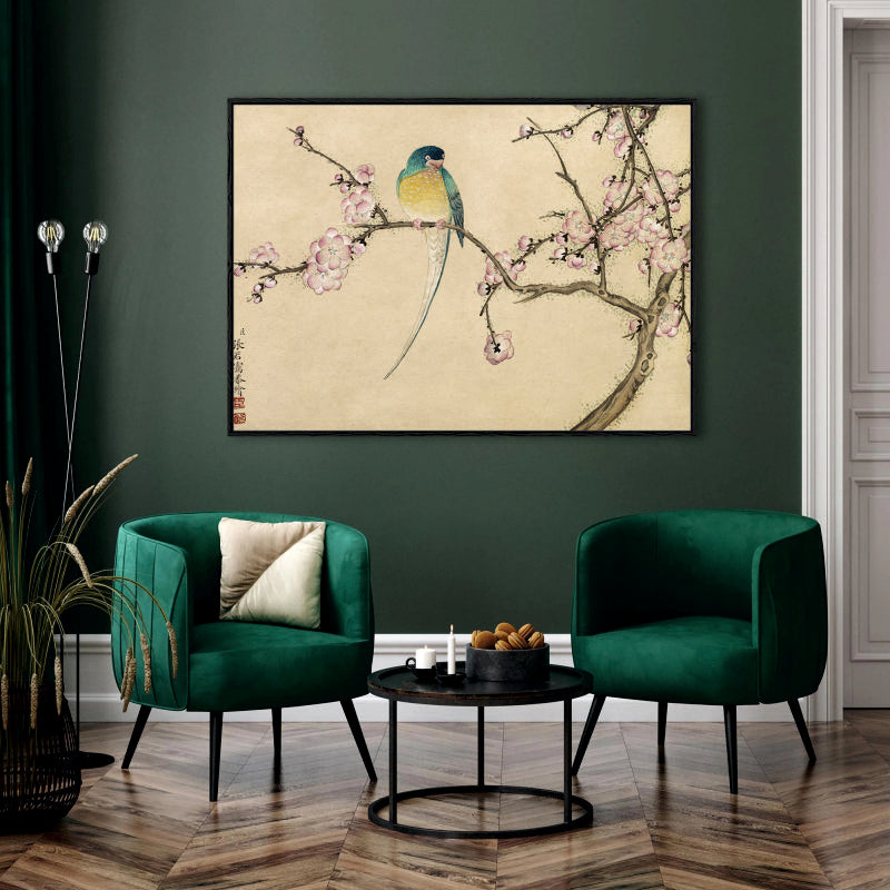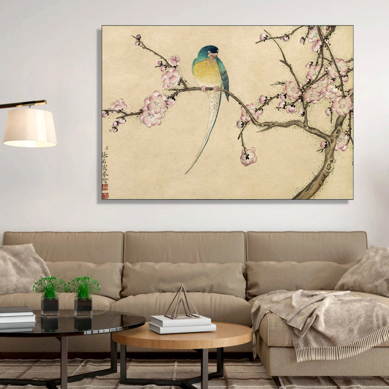 Spring Serenade Aesthetic Canvas Digital Painting - Bird on Blossoming Branch