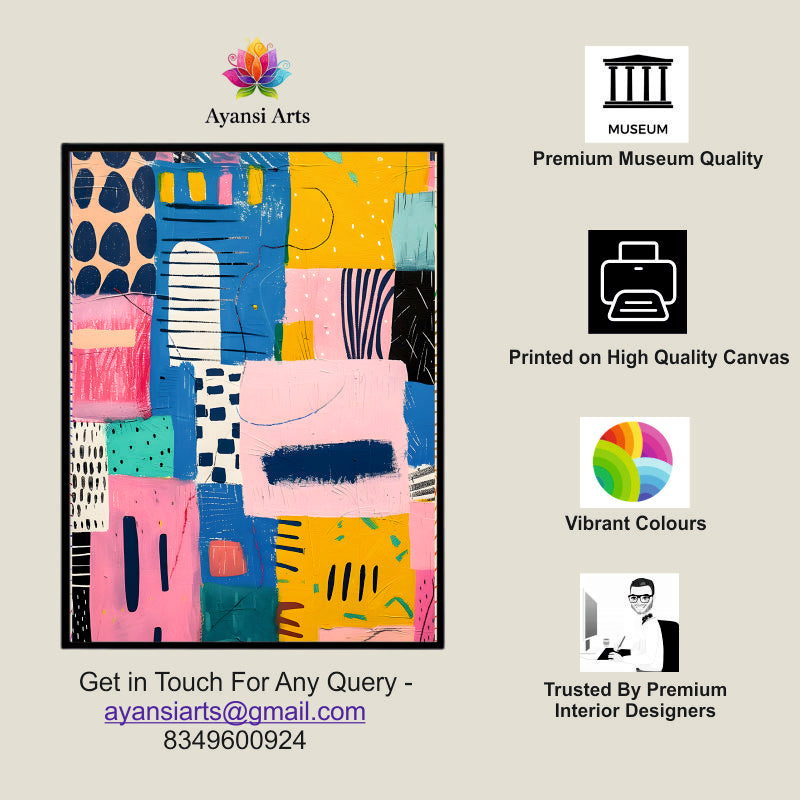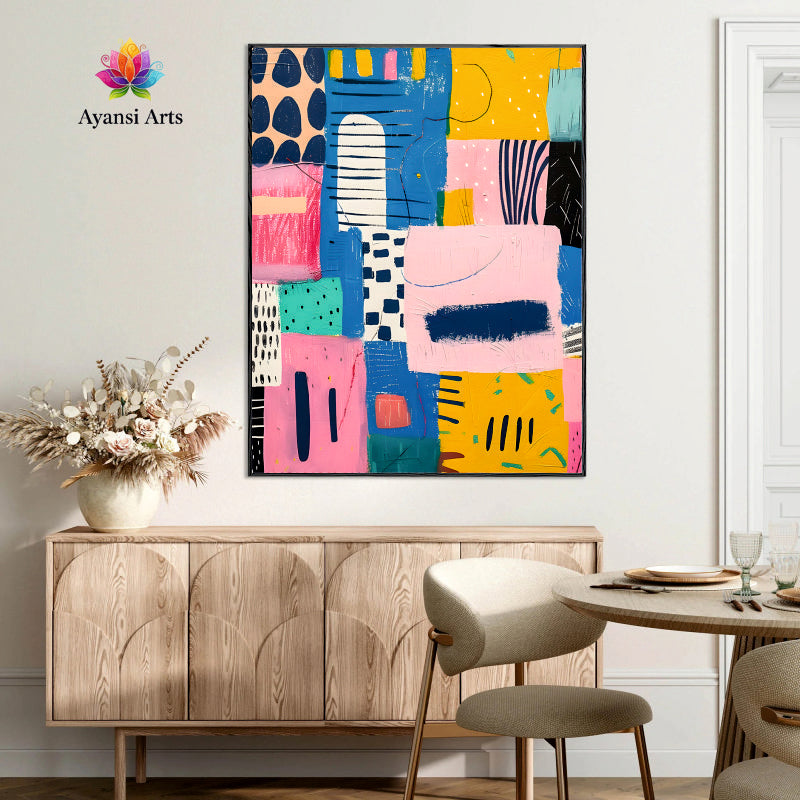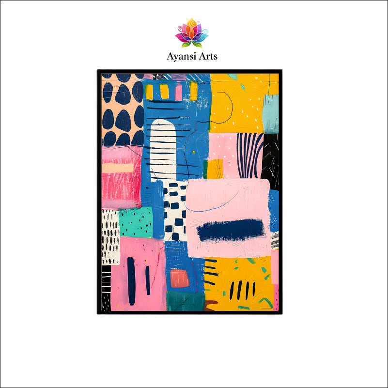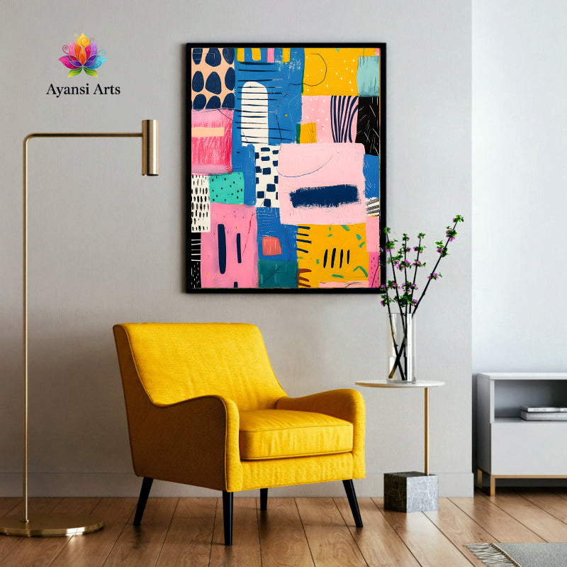 Brighten up your space with "Urban Vibes", a vibrant, high-quality digital canvas painting from the exclusive collection of Ayansi Arts. This bold and playful abstract artwork features a striking fusion of geometric shapes, vivid hues, and layered patternsβcombining neon pinks, electric blues, sunny yellows, and deep blacks to create a cityscape of imagination and rhythm.
